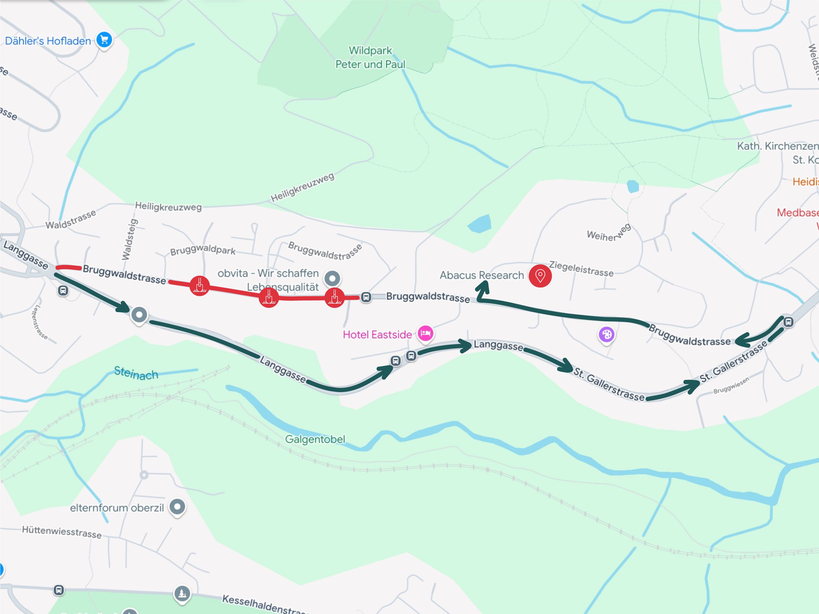 Die Buslinie 11 St.Gallen Hauptbahnhof zum Abacus-Platz erhält während der Bauzeit eine geänderte Streckenführung. Die Haltestelle Abacus-Platz bleibt weiterhin in Betrieb. Es ist mit längeren Fahrzeiten zu rechnen. Eine Alternative bietet die Buslinie 4 Richtung Wittenbach Bahnhof, Haltestelle Sonnrainweg. Von dort sind es nur 5 Gehminuten. Die Fahrzeiten findest du unter sbb.ch.